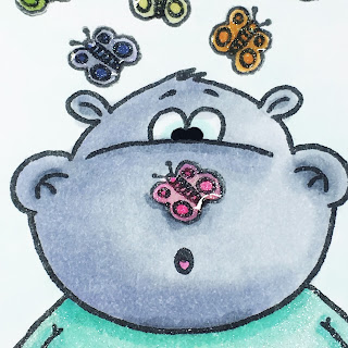 I coloured the images using a combination of copic and spectrum noir alcohol markers. I used greys for the hippo and added a light purple to his undertone for a twist! There was purple in the paper so I thought it would be fun! I coloured the hippo's t-shirt and all of the butterflies in bright colours that matched the paper I used from the Doodlebug Designs Fairy Tales collection.
