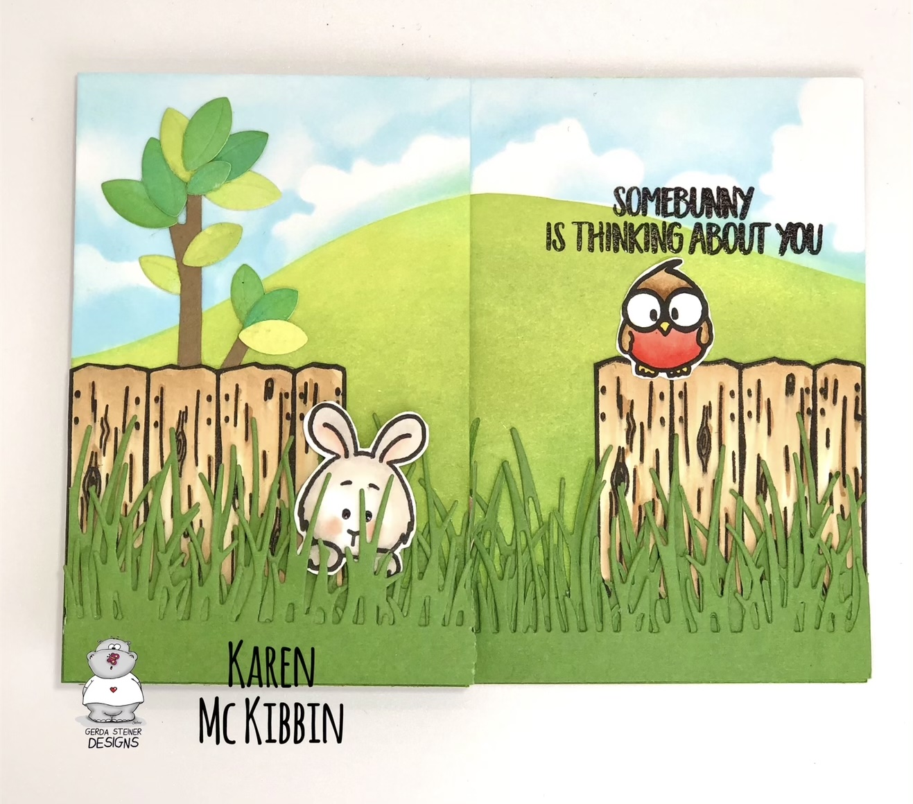 I used Copic markers to colour all the images from the “Hoppiness” stamp set from Gerda Steiner Designs but couldn’t fit one of the bunnies on in the end. I also stamped and coloured two fence sections and two butterflies.