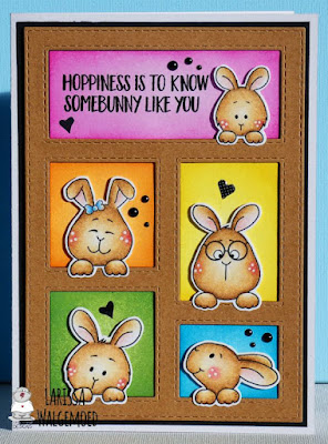 Hi everyone, I am Larissa from Car-d-elicious and today it is wednesday and it is my turn again to post a card on the blog from Gerda Steiner designs. This time I have made a card with the clear stamp set Hoppiness from Gerda Steiner designs. I have stamped the bunnies and then I coloured them with my Polychromos pencils, the black glaze pen and a white gelpen. I have cut all the images with the Hoppiness matching dies from Gerda Steiner designs.