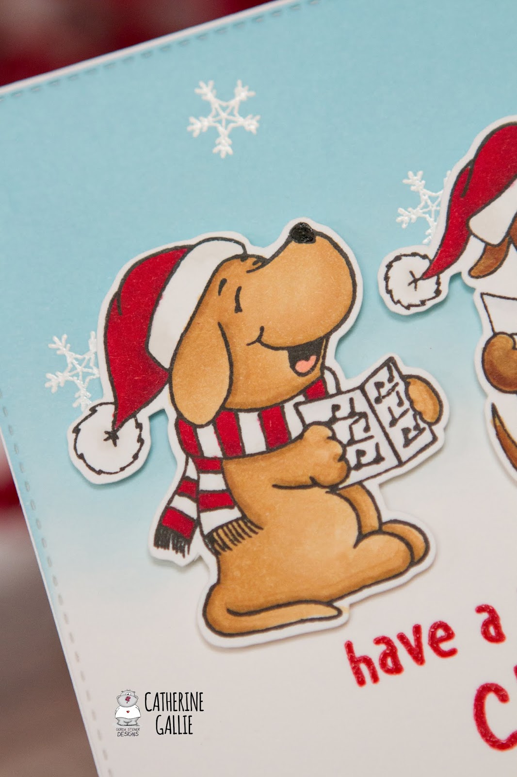When these pups were ready, I placed them on the panel to see where I should stamp my sentiment. Using red ink, I stamped the sentiment towards the bottom of the panel and I also embossed over the top using clear embossing powder. (Side note: I love this sentiment! So funny!