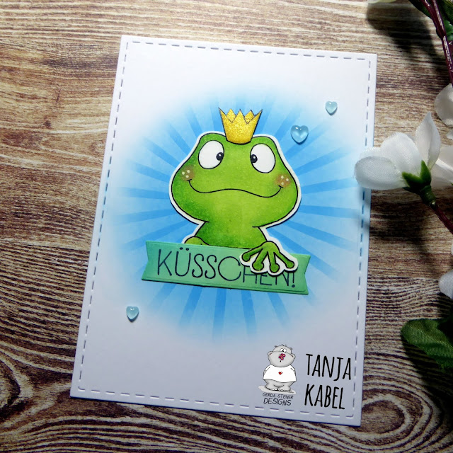 it's Tanja here and Gerda Steiner has released the fabulous new Frogs stamp set with English, Spanish and German sentiments and over the next three weeks I will show you my creations with the Gerda Steiner Designs German Froesche set. This little frog prince is my first creation: