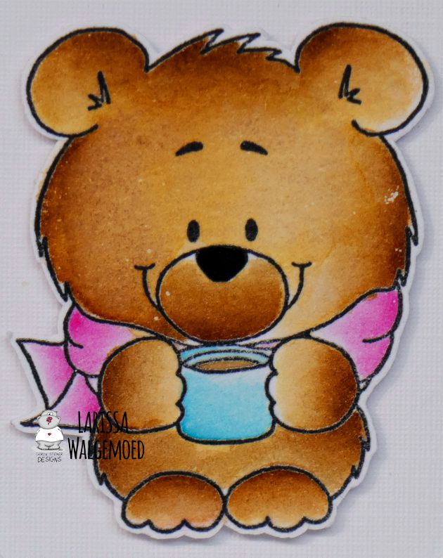 Hi everyone, I am Larissa from Car-d-elicious and today it is my turn to post a card on the blog from Gerda Steiner designs. This time I have made a card with the Warm fuzzies clear stamp from Gerda Steiner designs. This image is also available as a digital stamp: Warm fuzzies digital stamp. I have stamped the image with Versafine clair nocturne ink on watercolour paper and then I embossed the image with clear embossingpowder. Then I coloured the image with Distress inks and then I have fussy cut the image.
