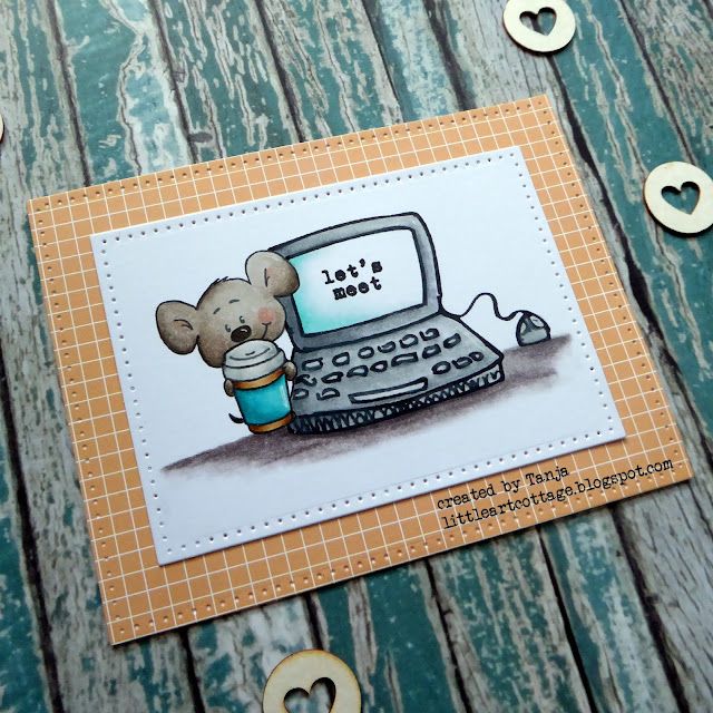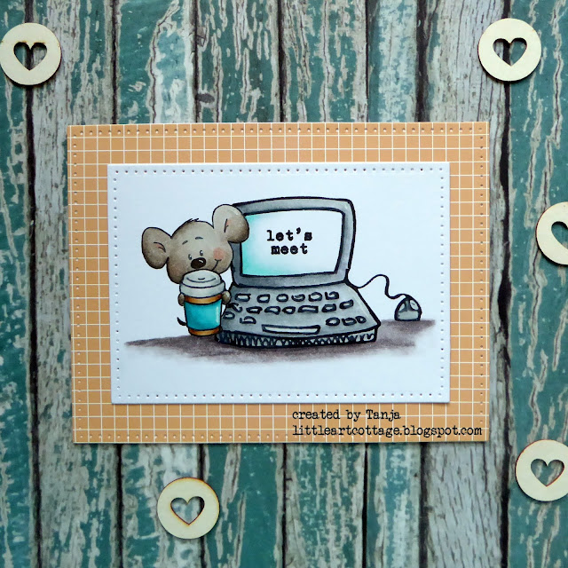 • stamp the coffee mug from the Gerda Steiner Designs You're koalified set and mask it, stamp the mouse from the Gerda Steiner Designs Fall Mice set and mask it as well, stamp the computer and the sentiment from the STAMPlorations Hello you set