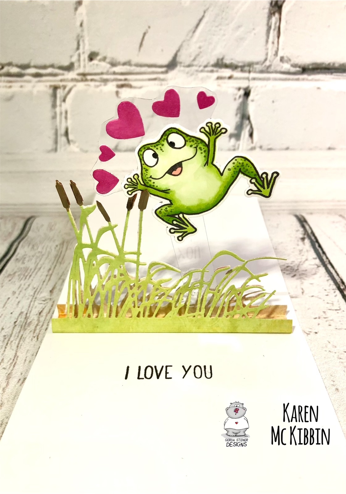 I used the cutest frogs I could find, which were the “Frogs” stamp set from Gerda Steiner Designs and I used copic markers to colour them in (YG11, YG03, YG17 and G20. For the spots, G94, YG67). I had a background already made on my gel press so I used that for the background. I just ran it through a geometric 3D embossing folder from We R Memory Keepers after I had stamped on the sentiment which is from the Frogs stamp set. There is actually much more dimension on this card than the above image shows. The white frame is the Wood Frame from Hero Arts and once I had that attached, I adhered the card front to the base.