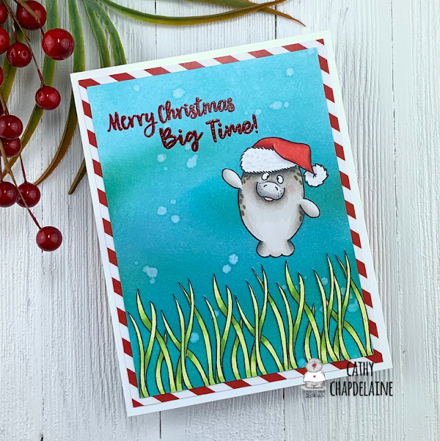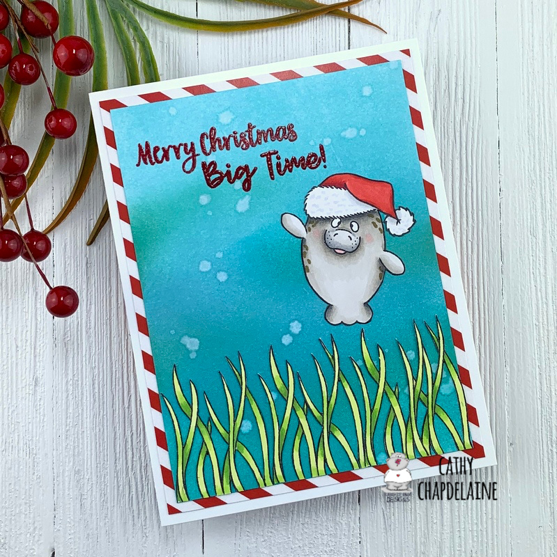 Happy Friday! Cathy here squeaking in one last Christmas card using one of my favorite all-time stamp sets! The Oh Manatee stamps are just too cute and I couldn't resist putting a Santa hat from the On The Table stamp set on this one.