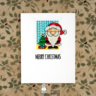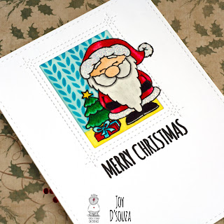 Next, I stamped the Santa using VersaFine Onyx Black ink and fussy cut it. Then, I coloured all the images with Zig markers and applied Distress Stickles on the Santa’s hat and suit. While this was drying, I stamped the sentiment on the A2 cardstock using VersaFine Onyx Black ink and then assembled the card.