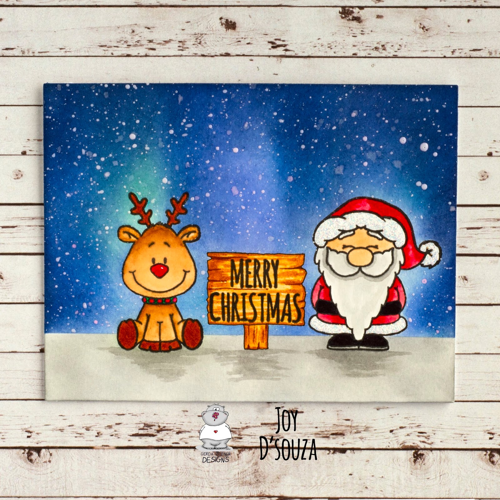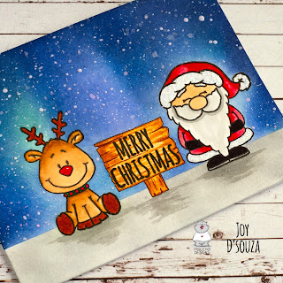 I stamped the reindeer, the Santa and the sentiment using Versafine Onyx Black Ink on an A2 watercolour cardstock. Next, I stamped the images on a masking sheet, fussy cut them and masked the images. I then drew the wooden signpost on both the cardstock and a masking sheet, to mask it. After that, I used Tumbled Glass, Shaded Lilac, Cracked Pistachio, Blueprint Sketch and Chipped Sapphire Distress inks to colour the sky. I then splattered white paint over it to create the stars.