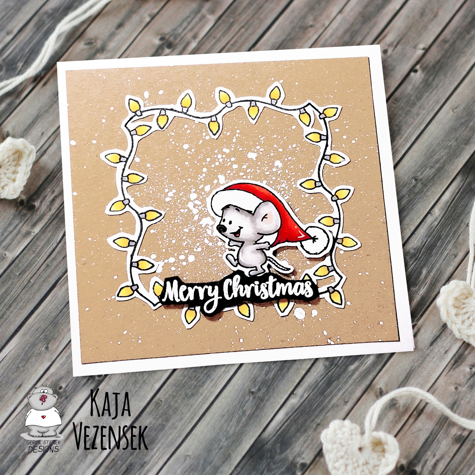 I used a brand new set called Balancing mouse and I stamped it using the Memento tuxido black ink. I decided to stamp out the square frame from the Christmas light along with a mouse. I colored everything in using alcohol markers.