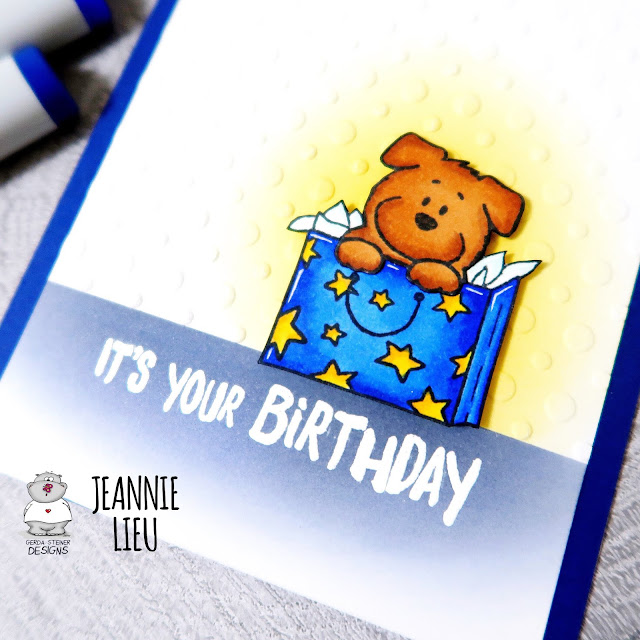 I used a piece of Bristol Smooth paper. I masked off part of the bottom of my card panel and added yellow distress ink so it surrounds where I want the image to be. I also used dark blue distress ink to ground the dog image. In this particular card I decided to stamp, color and fussy cut the image so I could place it on top of the yellow area.