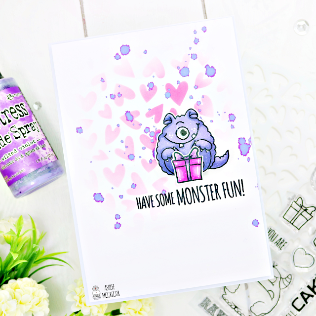 For my card I used a stencil from MFT to create inked hearts on the background and then using some distress oxide spray in Wilted Violet I added splatters all over it!!
