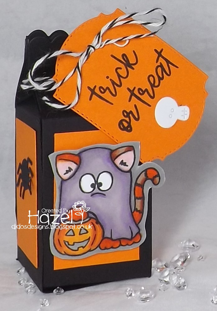 I could play all day with Halloween things so I went for a wee Trick or Treat Box for my second make today.  I have a carton die that I ran through my cuttlebug to make the box then colored the Ghost Kitty for my main image.