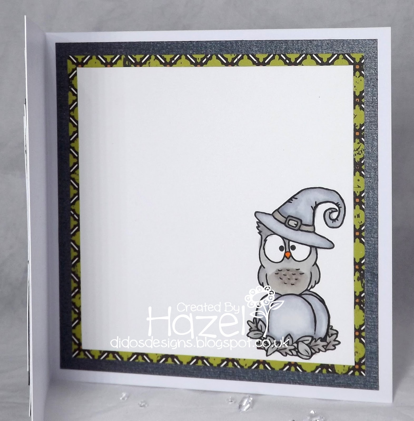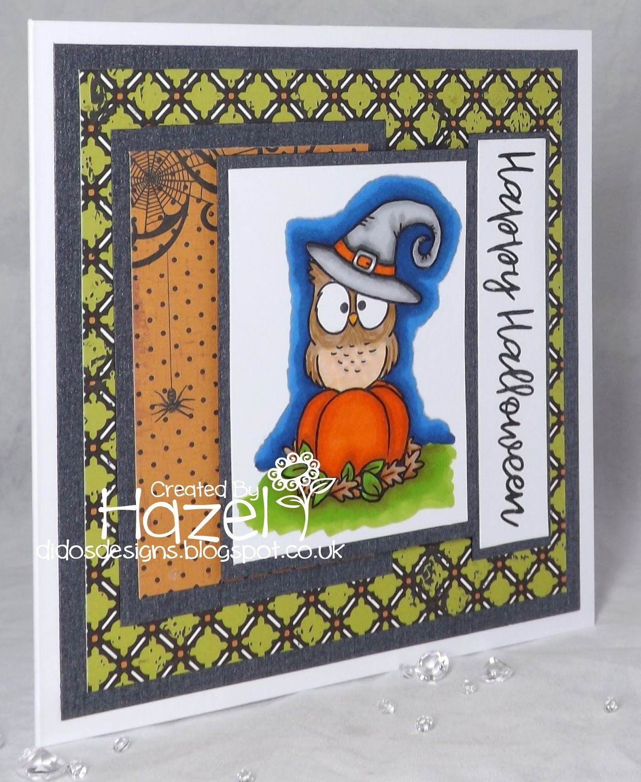 For my first creation I have used the pretty Owl and Pumpkin.  I coloured it using Promarkers. I did another monochrome one on the card insert to make it more interesting as well. I finished the outside using the Happy Halloween Stamp too. I love the font that Gerda has used here as it's so easy to read!!