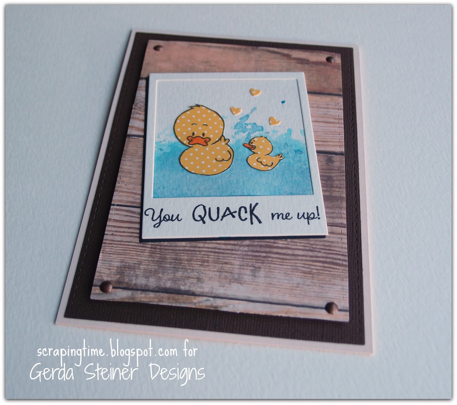 I love paper piecing and it´s very easy to fussy cut these ducks. I made the sea background with distress inks, water and a piece of acetate. Then I used a wood decorated paper and some brads for my panel. I love the font from the sentiment. It is so nice!