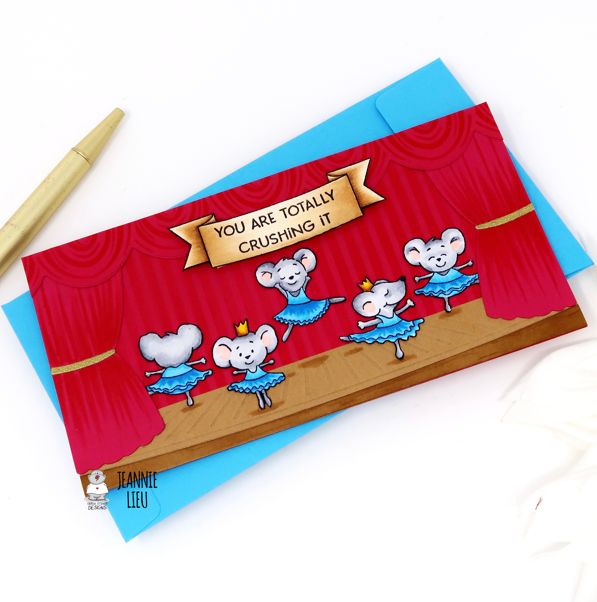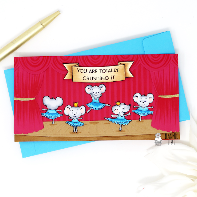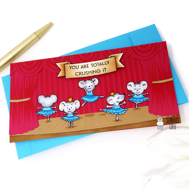 I decided to go with a mini slimline size since it's so popular right now and it was the perfect size for the stage and the ballerinas. The only downside is that I wasn't able to add the Nutcracker into the scene without making the stage size look too small. I'll just use him for another card!