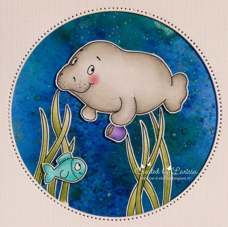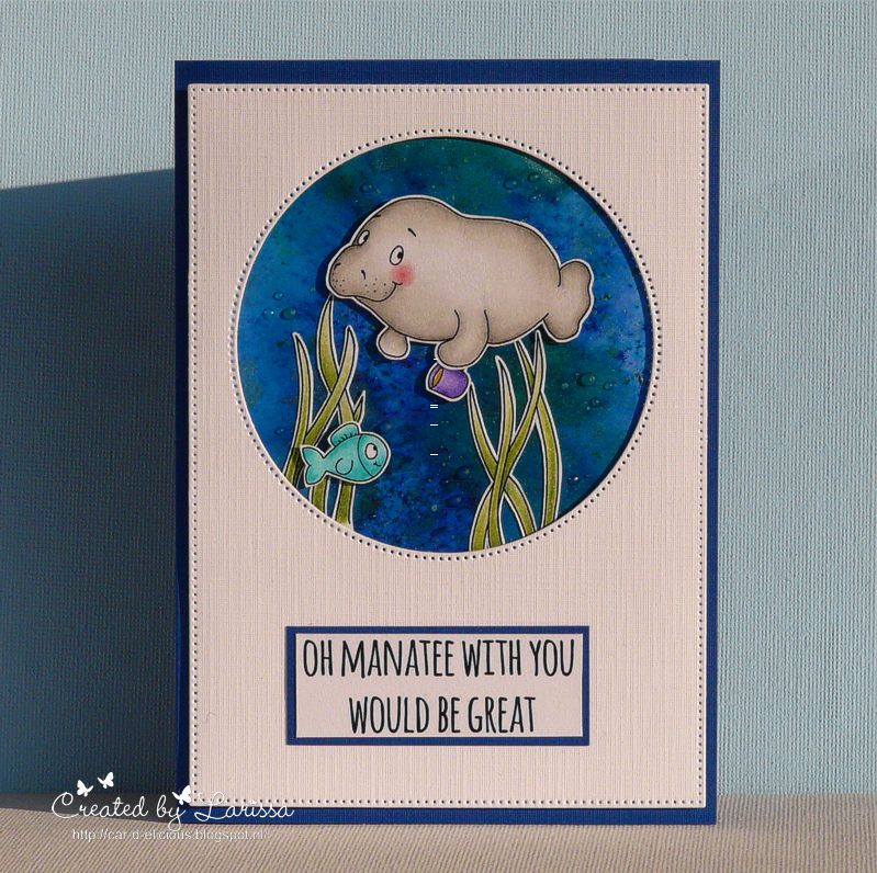 This week I have made a card with the stampset Oh manatee from Gerda Steiner designs. I have stamped a couple of images and then I coloured them with my Polychromos pencils. I have fussy cut the images. I have cut a rectangle from white cardstock with the Crea-nest-lies XXL 52 from Crealies. Then I have cut a circle out of it with the Crea-nest-lies XXL 49 from Crealies. I have made a a background for the images on a piece of watercolor paper with Ultra marine and Emerald green Brusho. Then I made some paint splatters on the background with green paint from the Pearlescent colours palette from Finetec. I adhered the background on a blue card and adhered the white rectangle with foamtape on the card. I placed all the images inside the circle. I have used Crystal glaze from Nuvo to make a couple of little drops on the background. I have stamped a sentiment from the set Oh manatee from Gerda Steiner designs on white cardstock and then on blue cardstock and then I adhered them on the card.