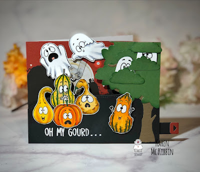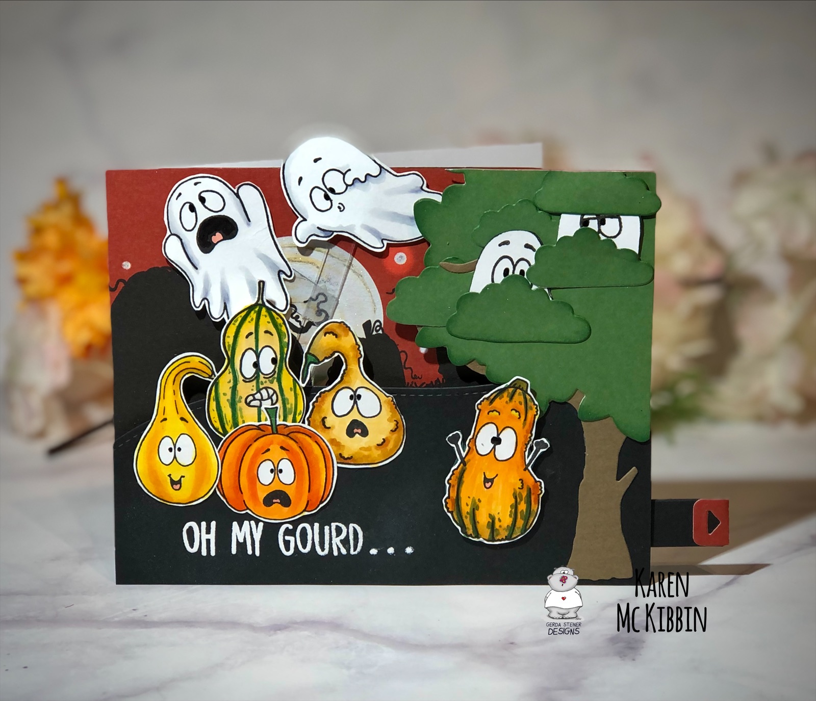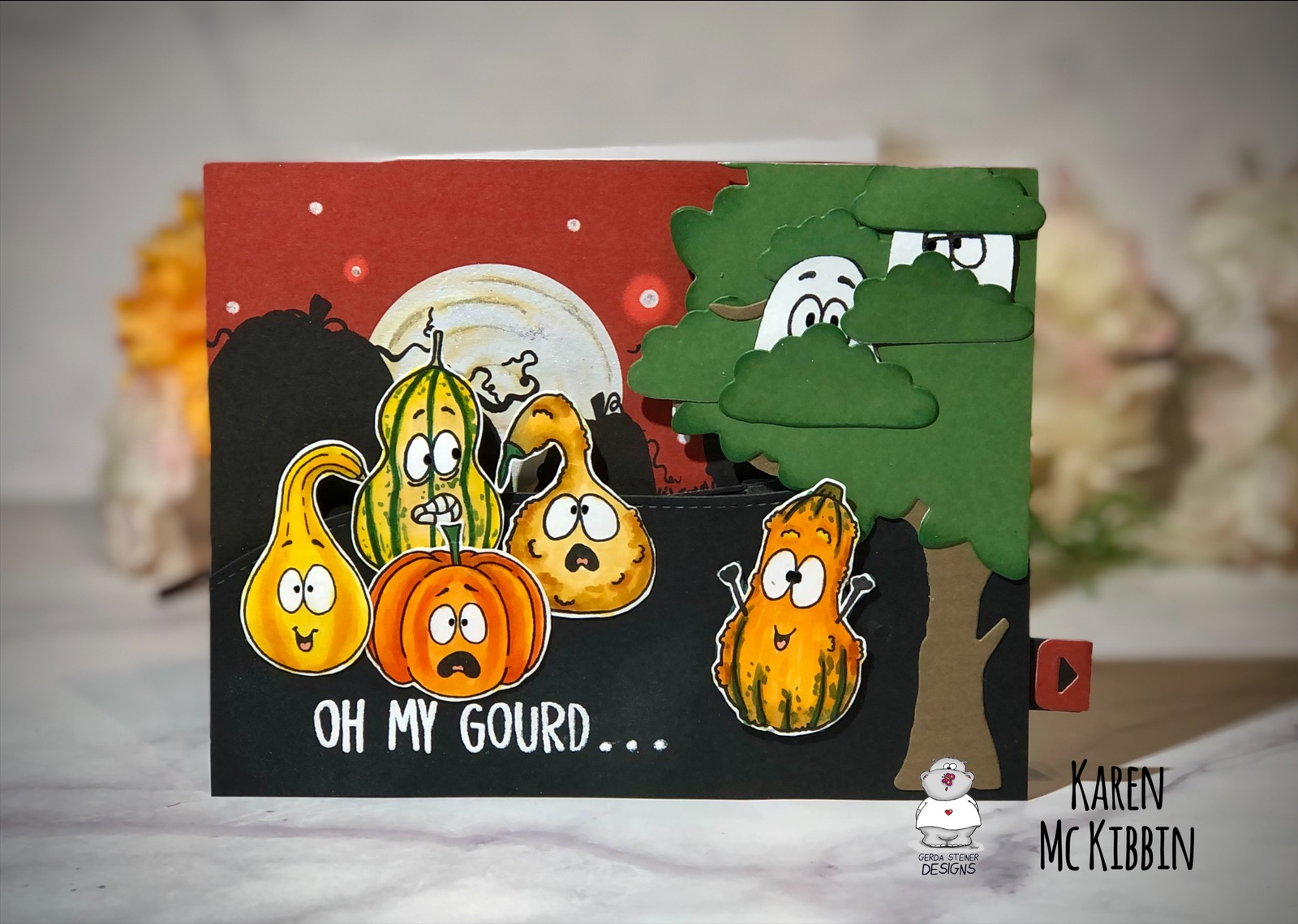 Hello, it’s Karen here again and thank you for stopping by. I’ve got a fun, interactive card today that features a new stamp set from Gerda Steiner Designs called Gourds. I would like to point out that I made my card say “It’s Your Birthday” on the inside, but it could just as easily have said “It’s Halloween”, as that sentiment is also in the set. Here’s a look at the card: