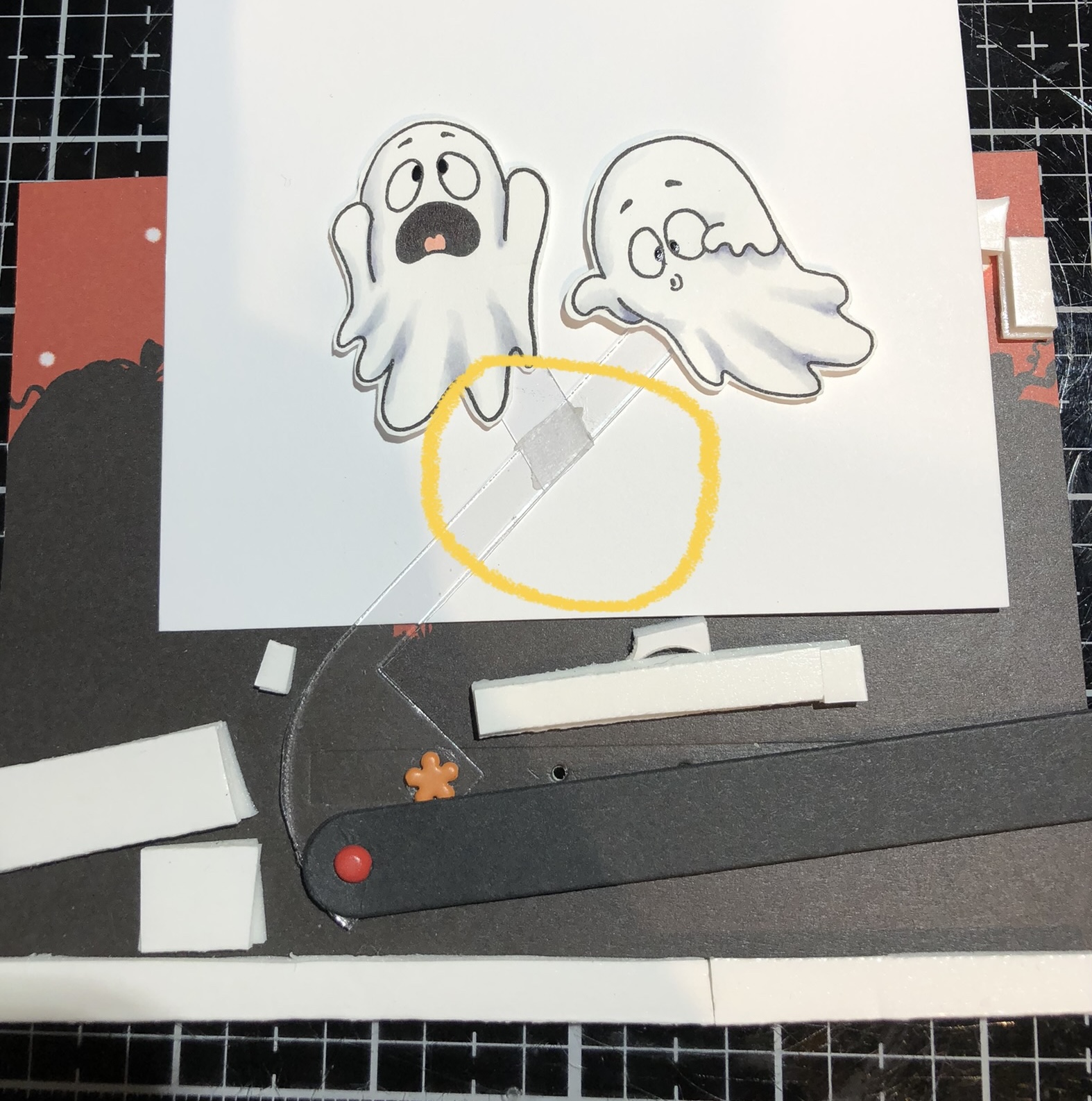 I started by stamping the inside sentiment onto my card base, as I usually forget to do this while it’s easy to do. On the front of the card, I used a piece of cardstock from the Happy Haunting collection from Craft Consortium for the background, but you could just as easily create an ink blended background. I added a little Nuvo shimmer pen to the moon and stars. The next step was to use the Swish ‘n Pop Pull Tab die set from Lawn Fawn to add the interactive element on this card. I used the die as instructed by Lawn Fawn with the one exception that I modified it to allow me to have two ghosts swing up. To do that, I added a small strip of packaging acetate with double sided tape, to the long die cut arm. Here’s a picture of what that looked like to help make it clearer.