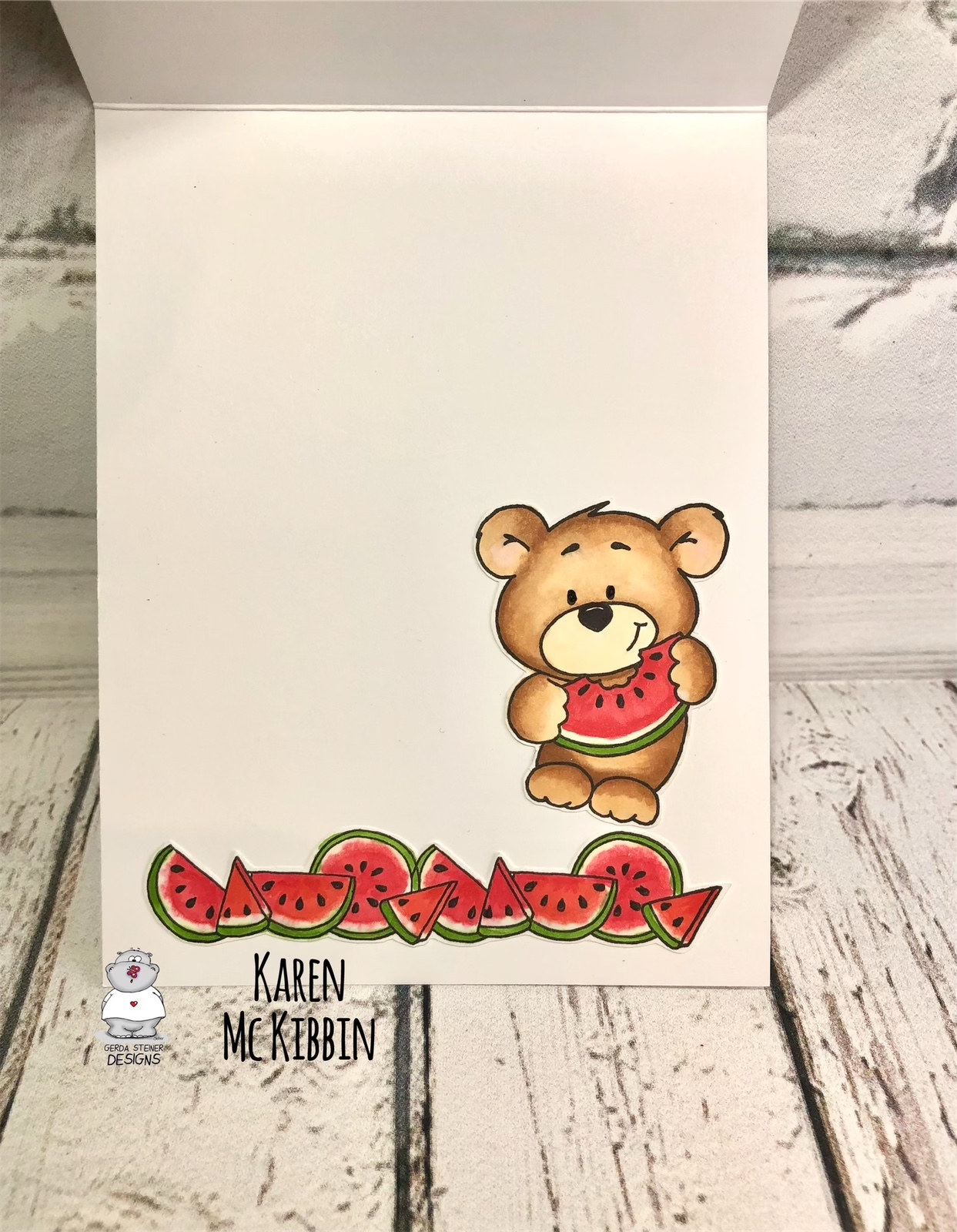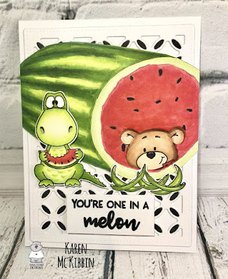 Hi and happy Wednesday everyone. It’s Karen here today and I want to share a card made with a brand new stamp set from Gerda Steiner Designs called Melon Friends. This is such a cute stamp set as you can see from the little critters on my card and it will be available in the Gerda Steiner Designs shop tomorrow!