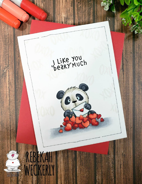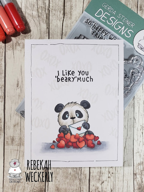 Step 3. Mask off 1/4 inch around the edge of the card then using a light gray ink, stamp the 'XOXO' sentiment randomly. Get close to but don't stamp over your panda! Stamps sentiment in black ink.