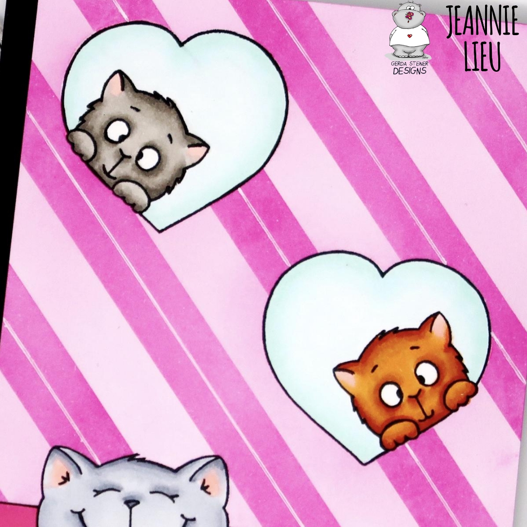 I immediately had the idea to stamp the kitty peeping from the heart and reverse stamp it so they were peeking through wall windows. Of course, this idea led to a scene card where the main kitty in sitting in front of the wall.
