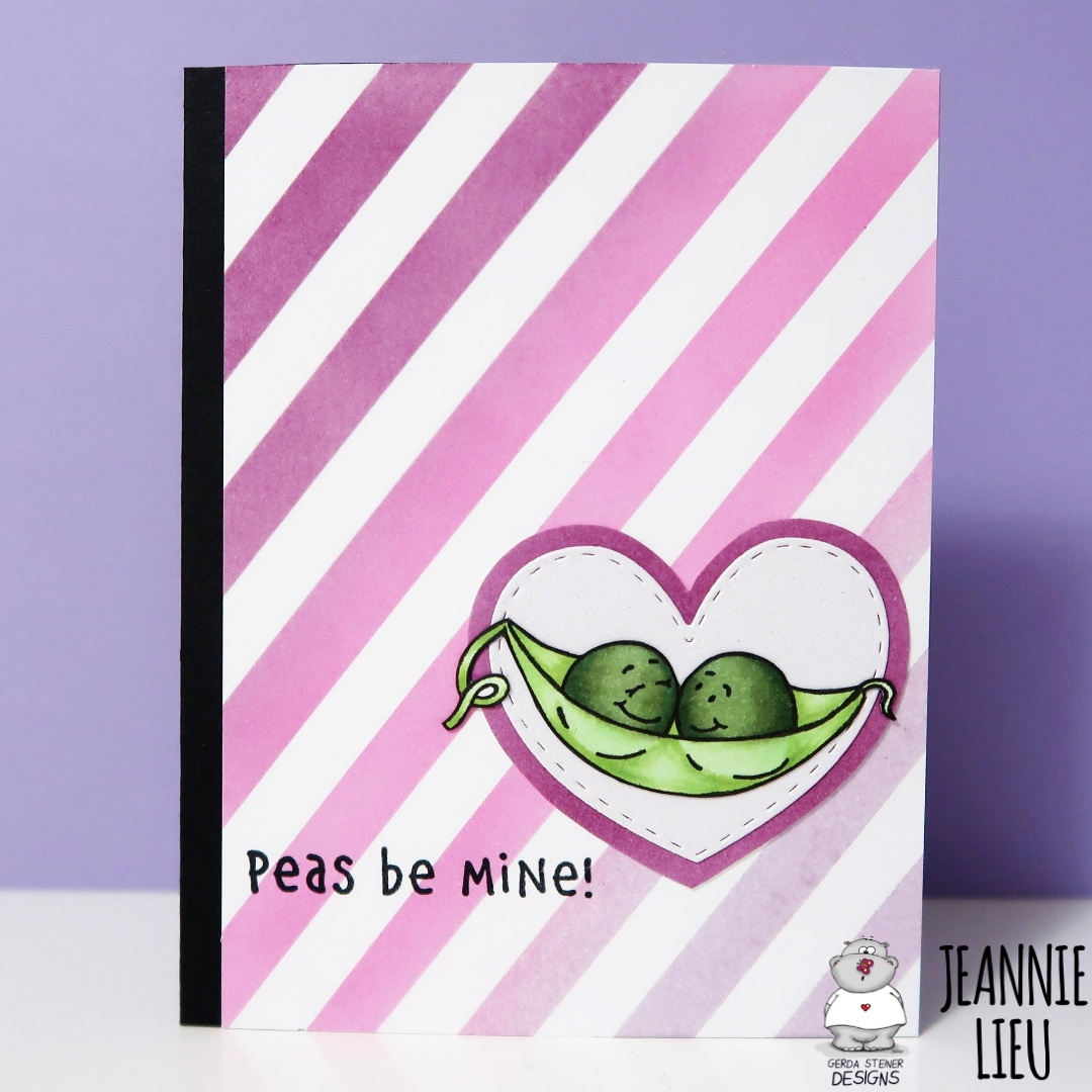 To finish this card off, I trimmed down the striped background by .25" and popped it on a black card base so it peeks out on the side. I added the sentiment "Peas Be Mine" on the left side of the image. I decided to keep it really simple.
