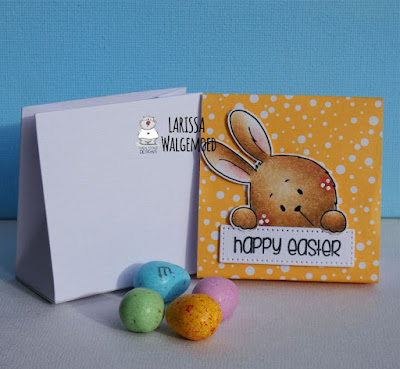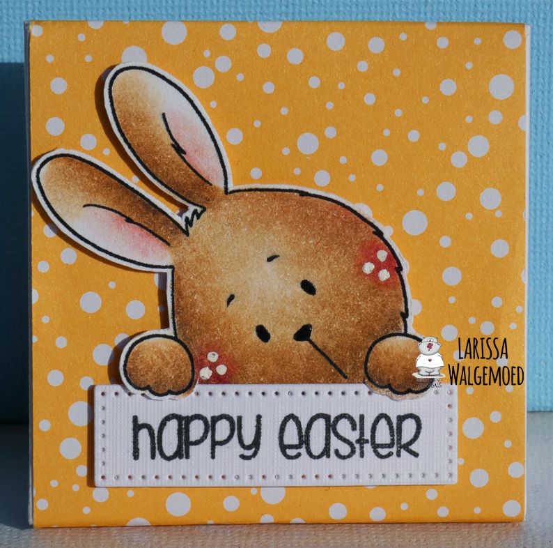 Hi everyone, I am Larissa from Car-d-elicious and today it is my turn again to post something on the blog from Gerda Steiner designs. This time I have made a card and a little box with the cute bunny from the clearstamp set Peeking easter friends from Gerda Steiner designs. I have coloured the bunny with my Polychromos pencils, the black glaze pen and a white gelpen. Then I have fussy cut the image.