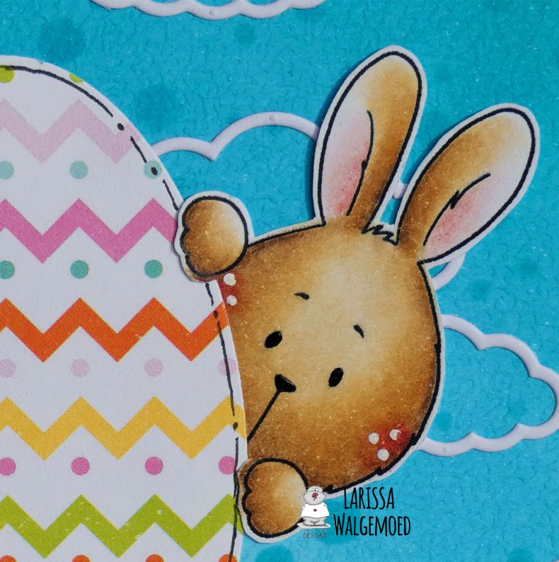 With the Multiframes - Straight easter egg (MFD089) from Nellie Snellen I have cut a large egg from patterned paper from the Celebrate easter paper pad from Echo Park. With a black fineliner I have doodled a line around the edges of the egg. I have die-cut a grass border from green patterned paper from the same paperpad with the Grassy fields die-namics from My favorite things. I have made a background on a white card with Peacock feathers Distress ink. I have added dots on the background with the Snowflakes stencil (PS8012) from Marianne design. I have cut a couple of clouds from white cardstock with the Cute cloud outlines die-namics from My favorite things and I glued those on the background. I have glued the bunny behind the egg and then I placed it on my card together with the grass border. I have stamped a sentiment from the stampset Easter cuties from CC. Designs on the grass border.