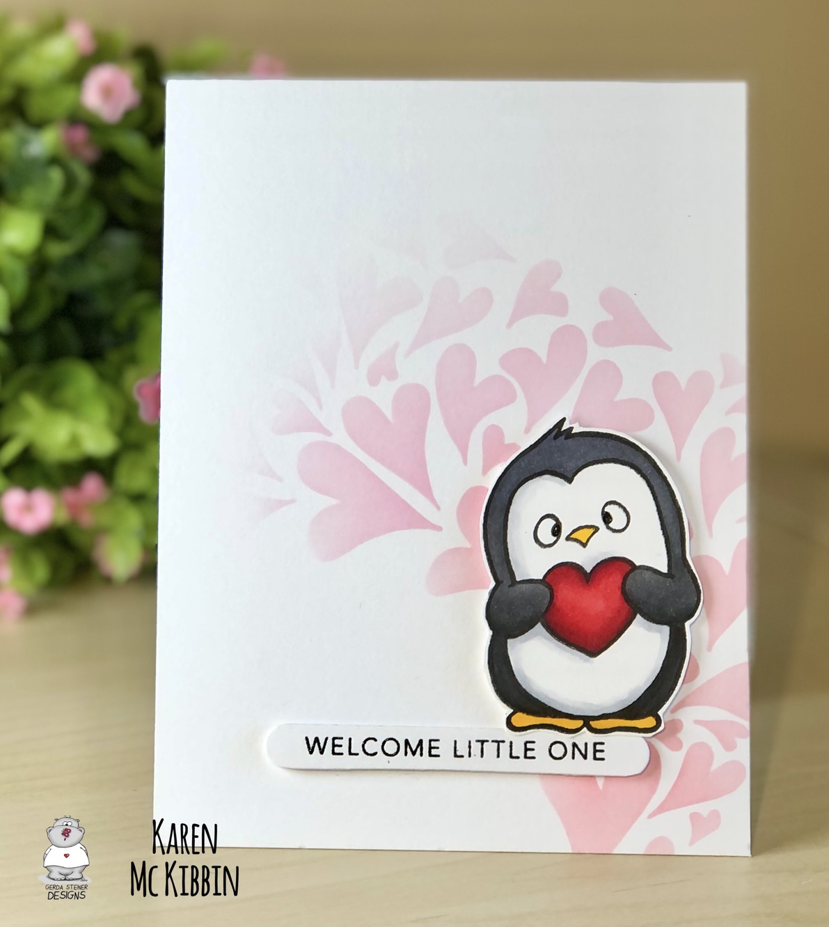 Hi there, it’s Karen here today and I have a cute little penguin card to share with you. I have to confess, I really struggle to make clean and simple cards. But I wanted this card to be sweetly simple, so I reined myself in when making this one. I had thoughts of adding glimmer paste, sequins, maybe an action wobbler etc, but I kept to my original idea of a CAS card. And I’m so glad I did because I actually love how this card turned out and how the penguin is the focus of the card. Plus, it was a super fast and easy card to make! I used the Penguin with a Heart stamp set from Gerda Steiner Designs for this one.