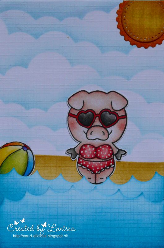 I have made a card with the stampset Pool piggies from Gerda Steiner designs. I stamped one of the piggies and the bal and then I coloured the images with my Polychromos pencils. I have fussy cut all the images. On a strip of white cardstock I made a background with the Mini cloud edges stencil from My favorite things and