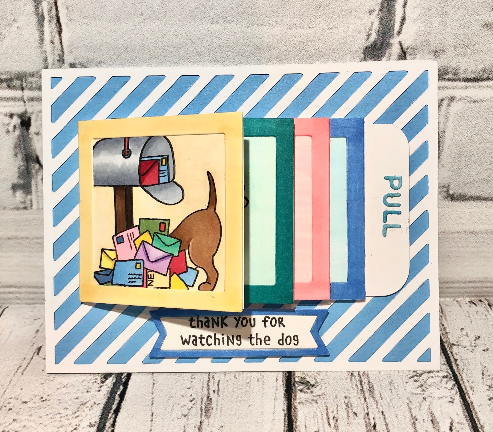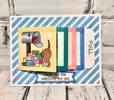 Hello everyone, it’s Karen here and I’ve got an interactive card today featuring the “Puppy Mail” stamp set. I’ve used all the puppy images in this set and have made a flip slider card with them. I love how this set can be used for a happy mail card but also a thank you card for someone looking after a dog.