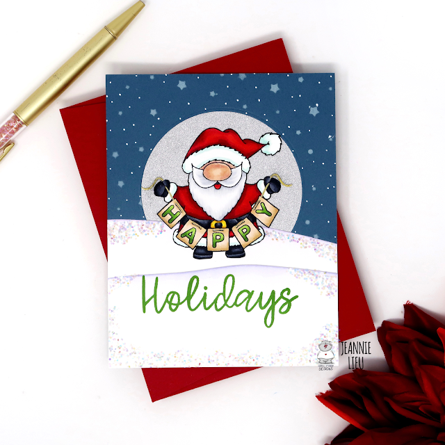 I added the Santa right in front of the circle and then stamped out the "Holidays" sentiment in a green ink matching the copic colored letters on the banner. After this, I thought I would be finished with the card but I thought it needed some finishing touches. I added additional white dots with a white gel pen to the background to make it a really snowy background. I also used some glue on the edges of the snow banks so I could adhere some glitter to it to add a little something extra to the card overall.