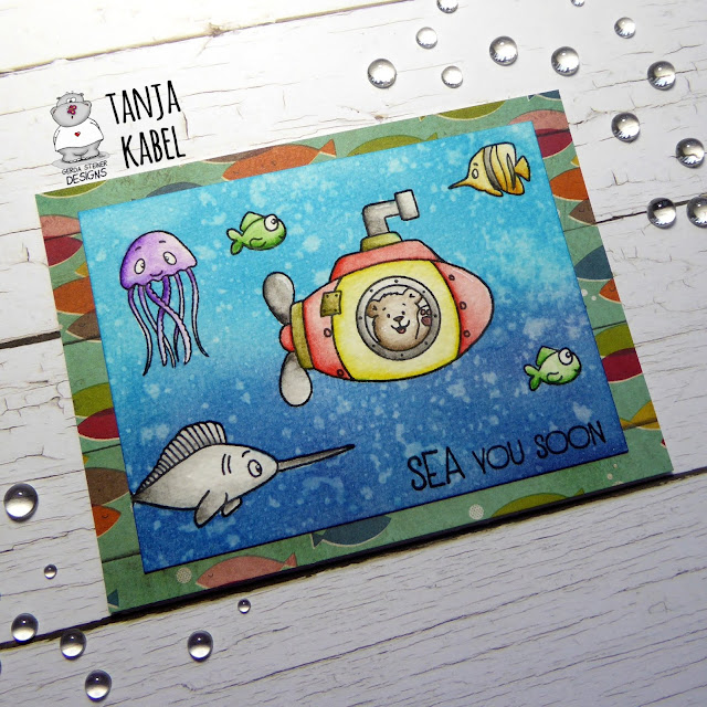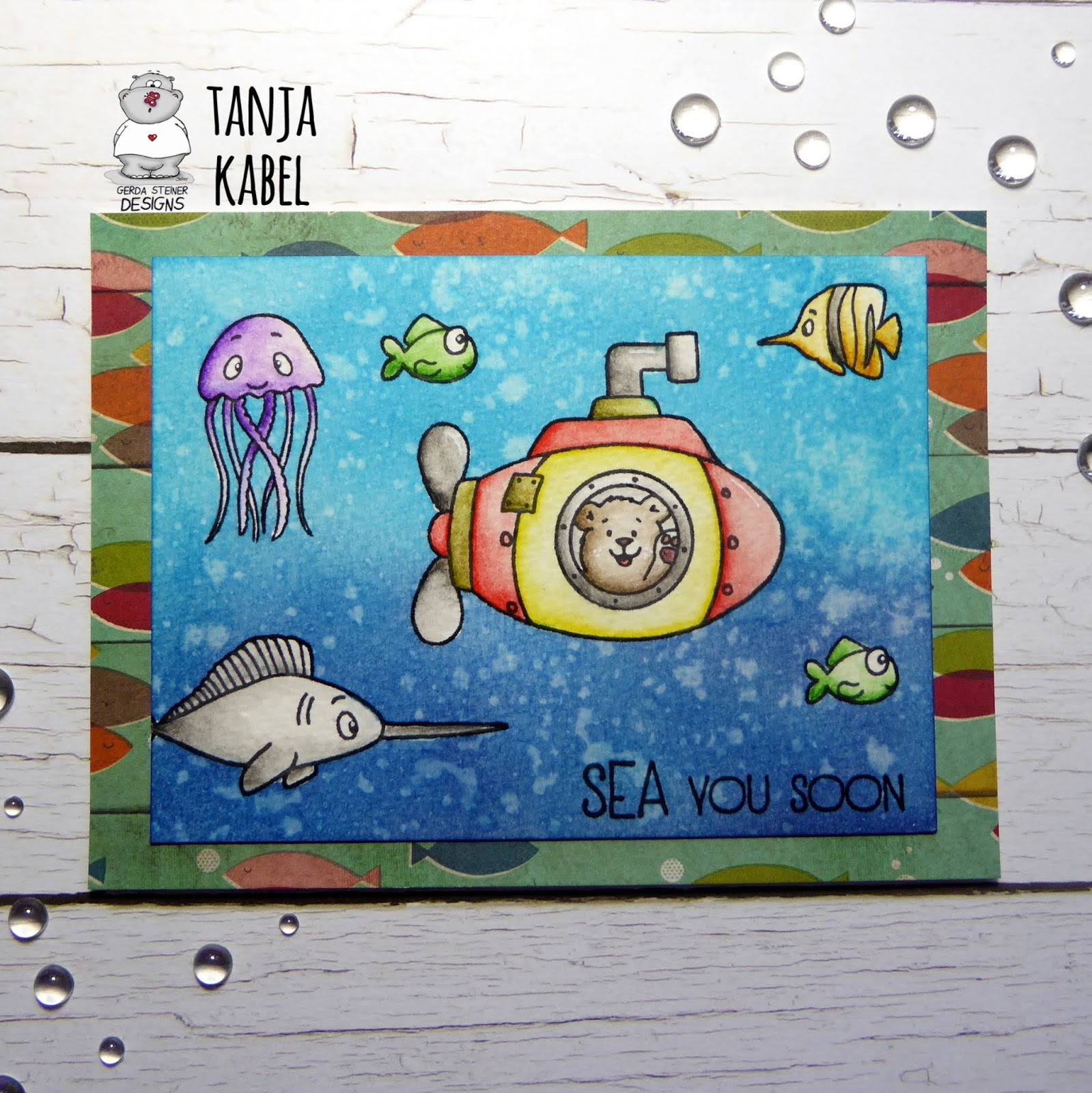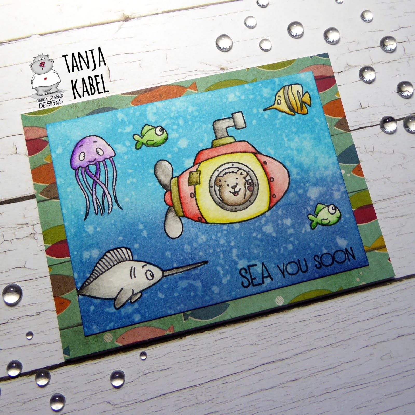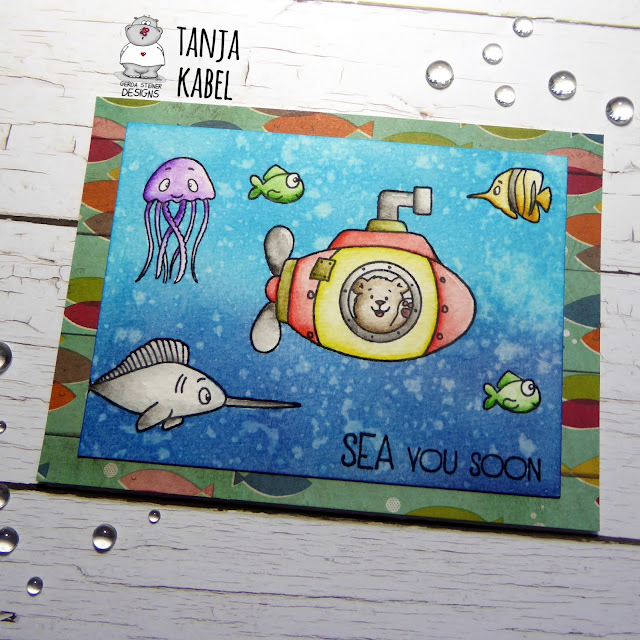 These are such adorable little sea creatures! The submarine is absolutely fun. Your background is lovely, too! Love those splatters in the water.