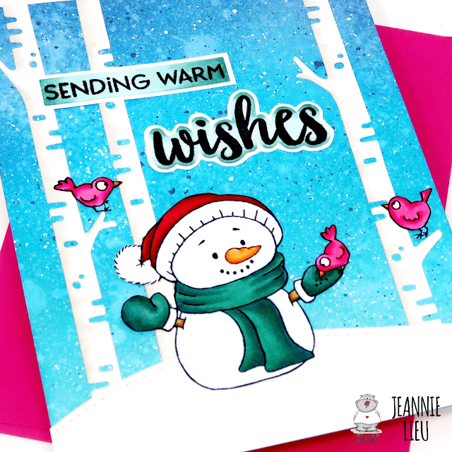 I also used a few die cuts from my stash to set up the scene (snow back and birch trees). I really love how winter cards have primarily white images and so if you have a bright background or some colorful characters (like the birds), it really pops!