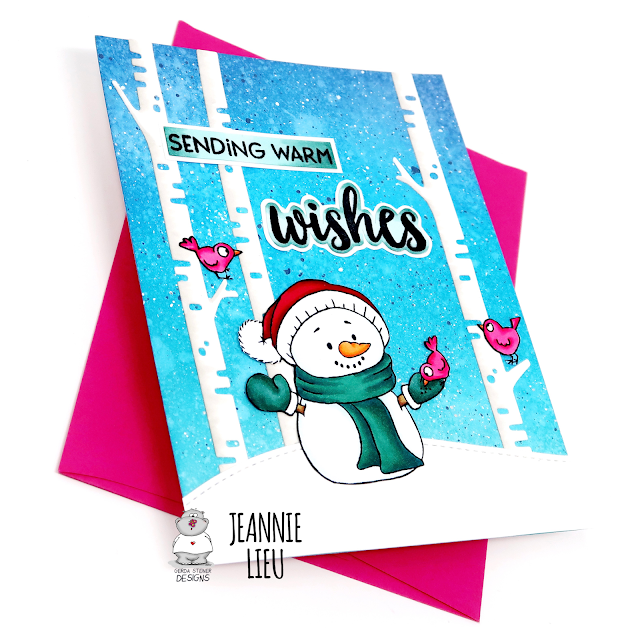 Hi everyone! It’s Jeannie (InsideoutJeans) on the blog today with Gerda Steiner Design’s stamp set named, Sending Hugs. The images in this set are super cute but I chose to focus on the snowman and birdies today.