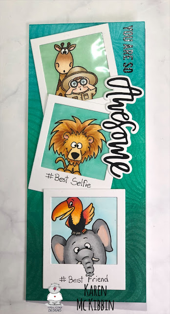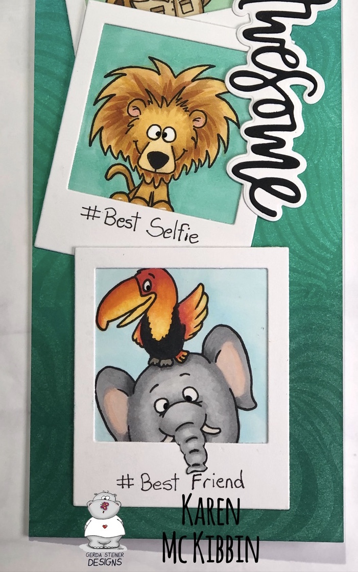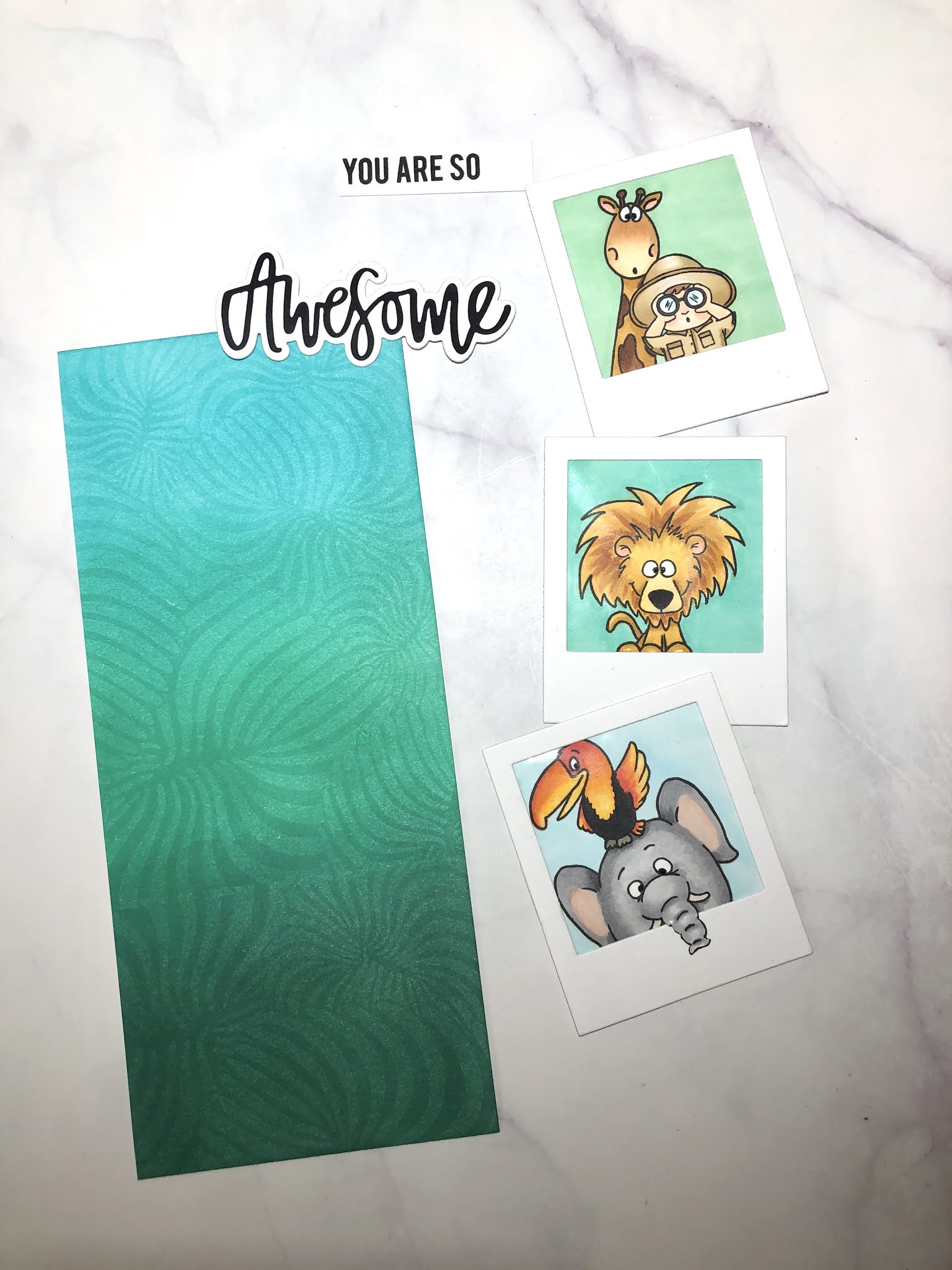 Next, I stamped out my images by masking as needed and allowing room between my images to cut them out with a square die (I used the Selfie Square die from My Favourite Things). I used copic markers to colour them in, and also for the backgrounds. I die cut 3 Polaroid frames from white cardstock using the Polaroid Shaker Frame die from My Favourite Things. I wanted my images to look glossy like a photograph, so on the back of these frames, I placed double sided adhesive around the opening, and then adhered some scrap acetate (from a stamp set packaging), trimming it down to fit the opening. Then I used a little glue to attach my coloured images to the acetate on the back of the Polaroid frames. Just for fun, I fussy cut around the elephant’s trunk and made that come out over the front of the Polaroid frame (I had to cut a small slit in the acetate to allow it to come out). Finally, I hand wrote the hashtags messages on the front since I didn’t have any stamps for this, so you can get creative with what you write or personalize it for a special person.