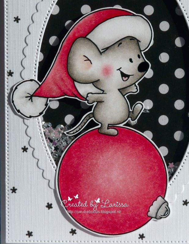 Polychromos pencils and the black glaze pen and then I have fussy cut the image. I decided to make a shakercard with this cute mouse. With the