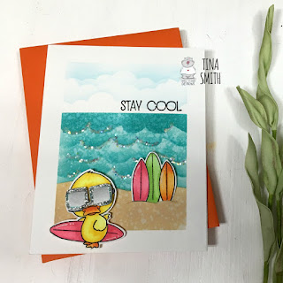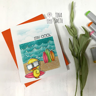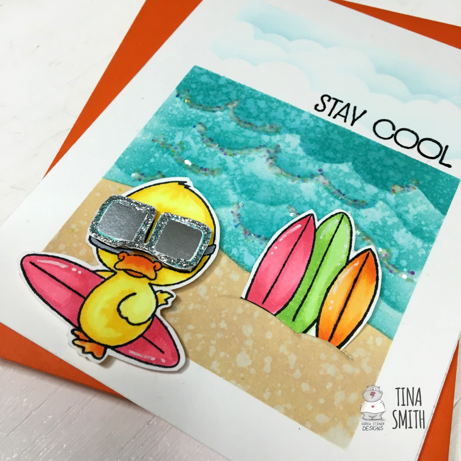 Hello and Happy Wednesday Crafty Friends!  Tina here from Cards & Coffee Time, today I am sharing a super cool card with the NEW Catch a Wave stamp set available now over at the Gerda Steiner Designs Shop.  Dude! This is an adorable set that will have you planning your vacation at the beach, chillin' in the summer sun and catching some waves!!  I used oxide inks to fill my background and bright alcohol markers to color in the images and love how it turned out.