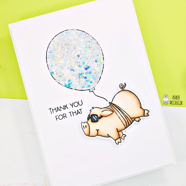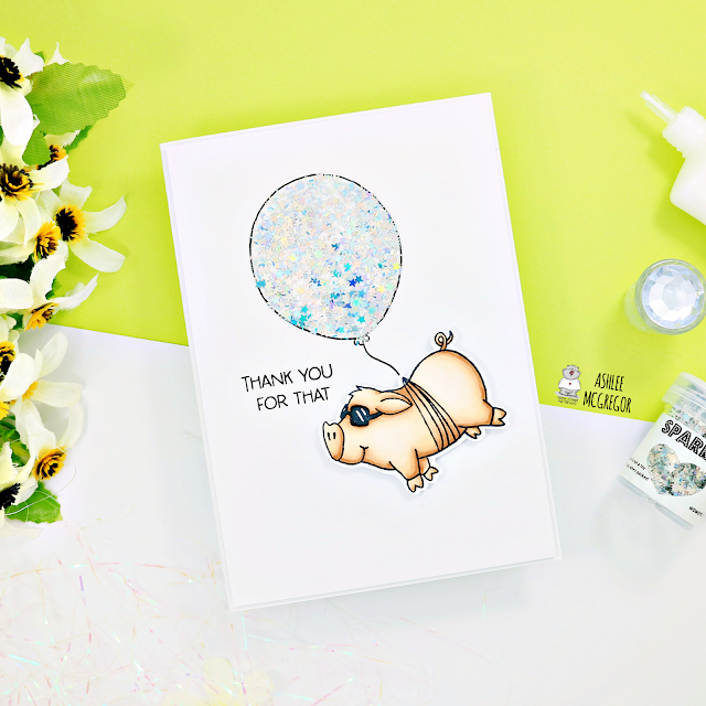 I then coloured up the cute piggy using Copic markers and attached to the card base with foam tape for some dimension....