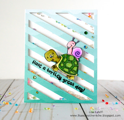 Hello crafty friends!!!  It's Lisa Lahiff here today, and I'm so excited to be back on the Gerda Steiner Designs blog sharing a sweet shaker card with all of you that uses the Turtley Great Stamp Set.  I know you have all been introduced to these adorable new guys, and now it's my turn to show you just how fun this set can be...