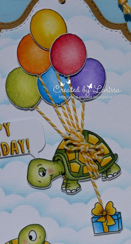 Mowed lawn distress ink. On the backside of the balloons I attached yellow bakers twine and then I wrapped the twine around the body of the turtle and then around the present. I adhered all the images on the tag with foamtape. I have coloured the sentiment and then I have die-cut it and added it on the tag with foamtape.