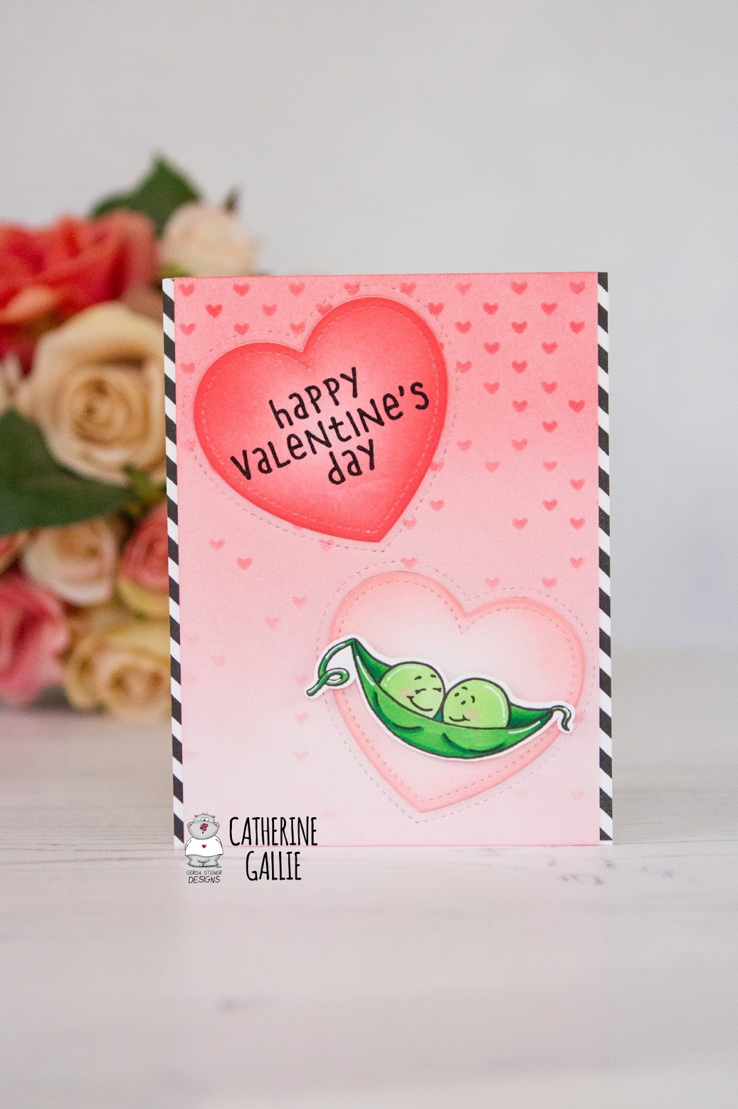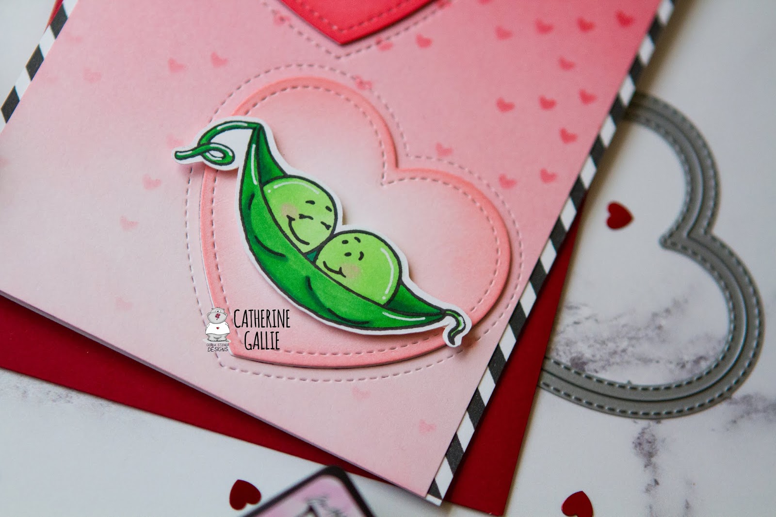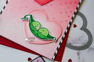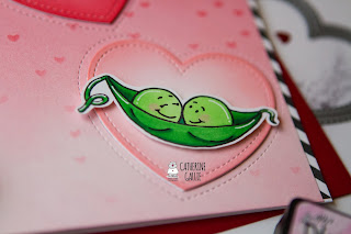 Now it was time to assemble the card. First I adhered the diagonal stripe piece to the card base and then adhered the pink panel on top of that and inlaid the stacked hearts into the die cut pieces. I adhered the pea image to the bottom heart using foam tape for even more dimension.
