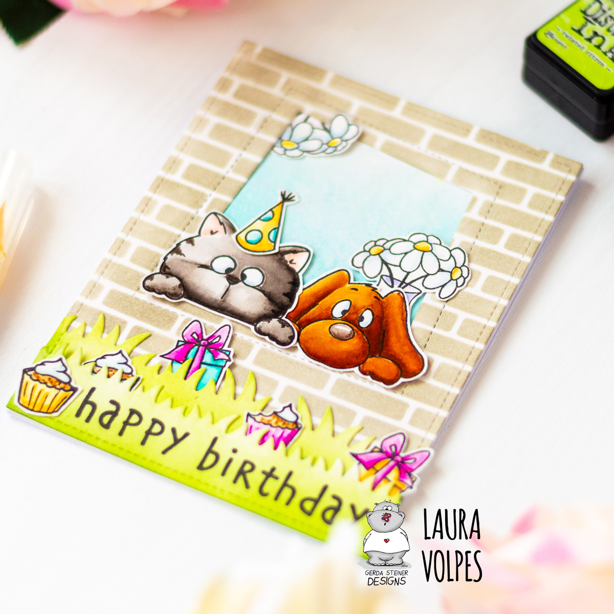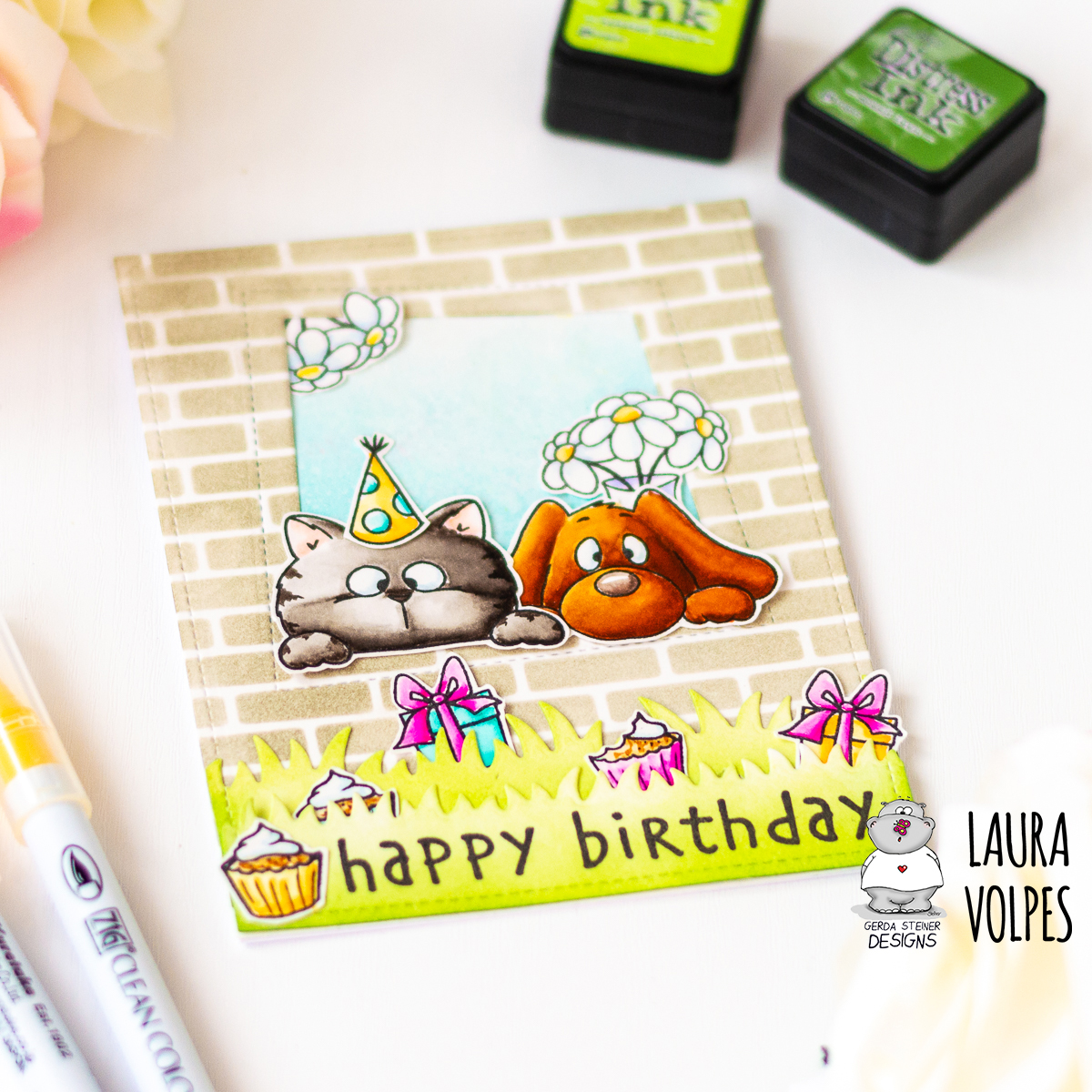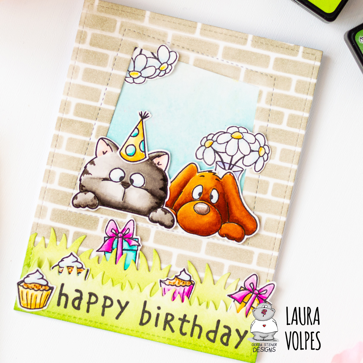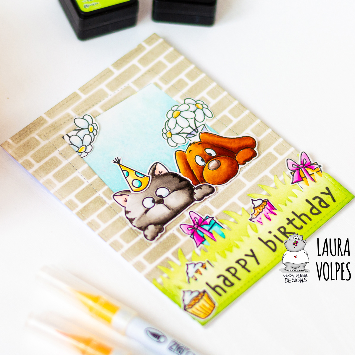 For my card base I die cut some more Bristol Smooth Cardstock by Strathmore using the an A2 stitched rectangle die. I then die cut an opening in the panel, which will be the window where the critters will peek through. I blended Distress Ink in Pumice Stone through the a stencil to create a brick wall effect.