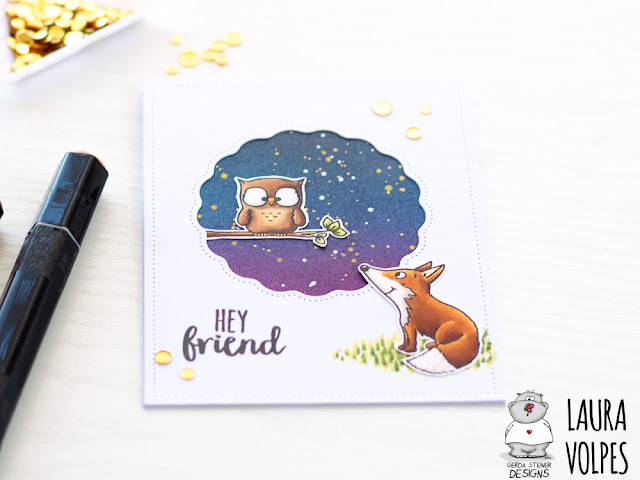 Instagram, you might have seen me color the fox during a live, a few weeks ago. For both the fox and the owl I used My Favorite Things Black Licorice Hybrid Ink for stamping and Spectrum Noir markers for the coloring.