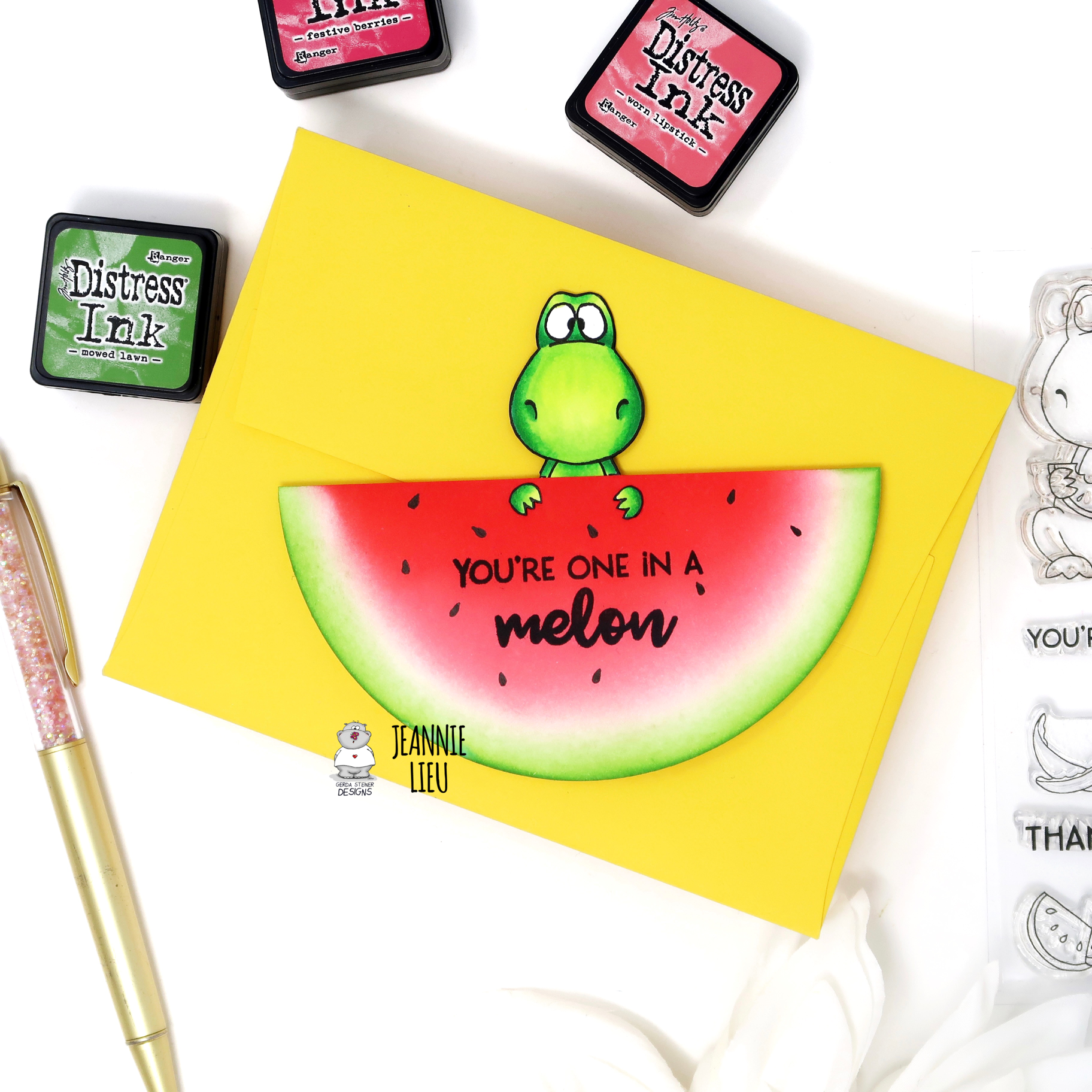 Hi everyone! It’s Jeannie (InsideoutJeans) on the blog today with Gerda Steiner Design’s stamp set named, Melon Friends. I have had this idea in my head every since I saw the set and finally got the chance to bring it to life. The dinosaur image in the set is such a cutie and I wanted to literally put him into a slice of watermelon. I also have a video to go along with this card -- check it out HERE.