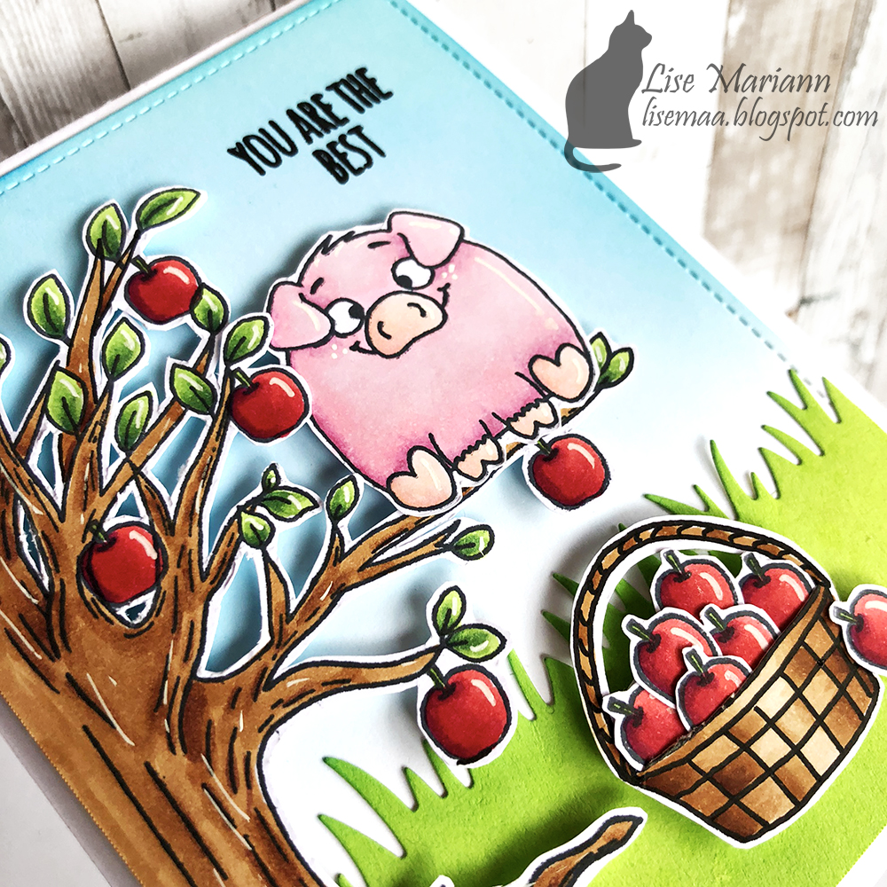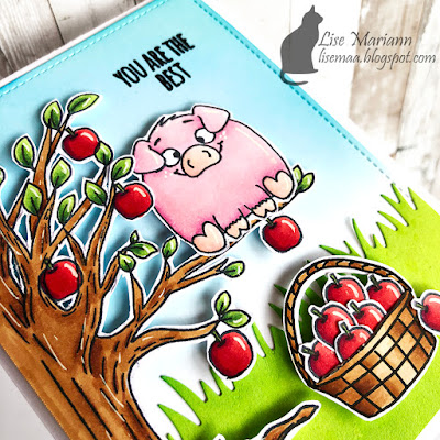 For my first card the next month I have made this cute apple picking pig-card. I'm not sure how he did manage to get up in the tree, but boy does he love it up there.