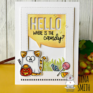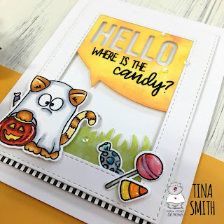 Hello Crafty Friends!  Happy Monday to you!  Tina here and Oh my Goodness...isn't this little dressed up kitty adorable!!!  I have to tell you...if I had a filled candy bowl, no doubt I would give this little guy my entire bowl:)