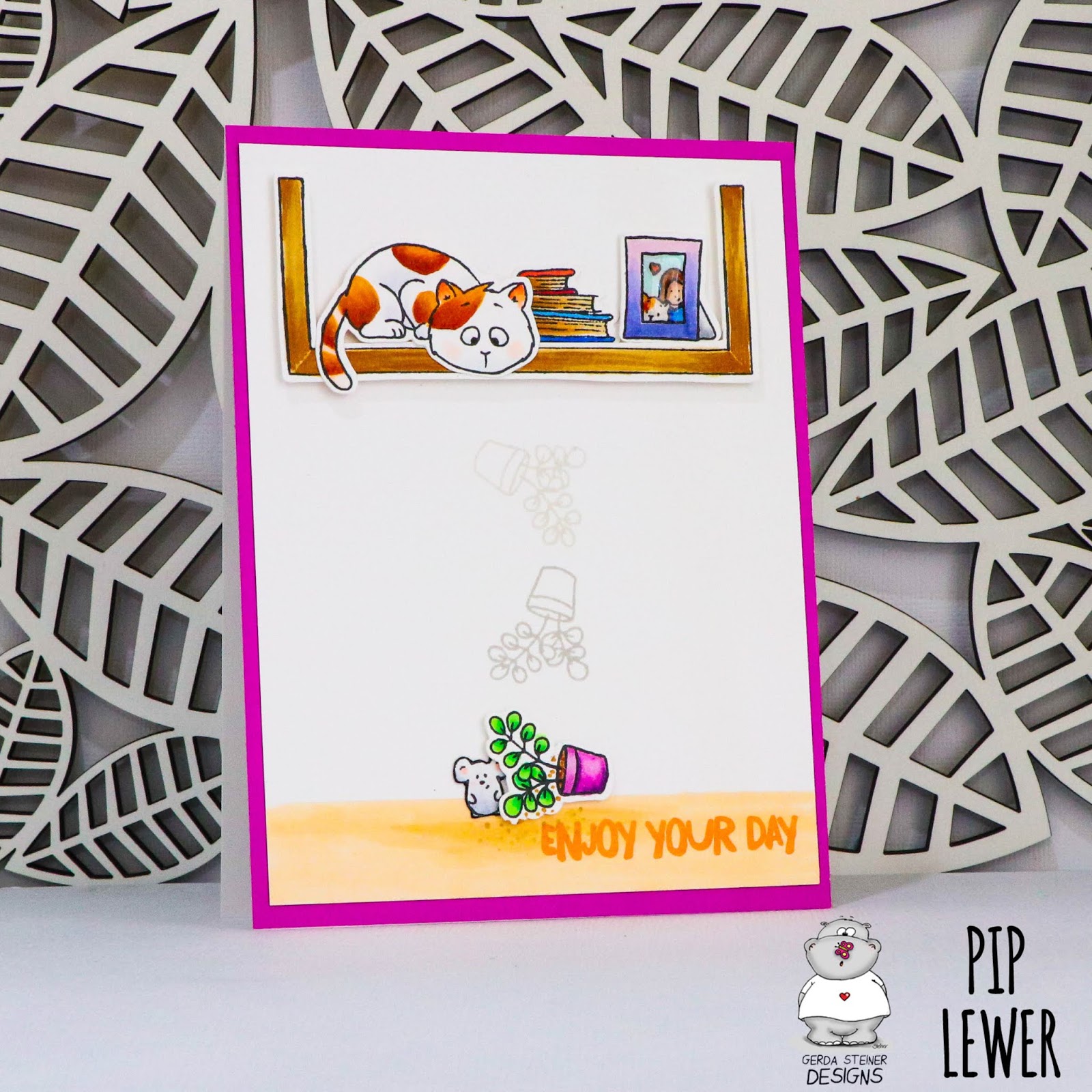 I wanted to show the movement of the pot plant falling so used a couple of shades of ink to stamp the image rotating to the floor.