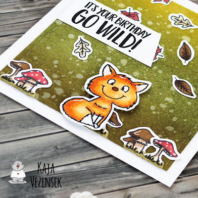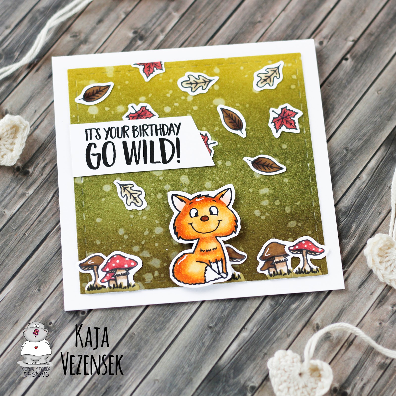 I used two GSD stamp sets for the images, the main one is called Foxes (the fox image and mashrooms) and the second one is called Happy fall (the leaves). I stamped everything out with memento tuxido black ink and then used alcohol markers to color them in.
