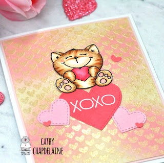 I kept the design of this on the simpler side to let the adorable kitty take center stage. I started by inking the background panel with Antique Linen distress ink. I added some Spun Sugar distress ink for a soft effect. After the inks were completely dry, I inked up a heart background stamp from La-La Land Crafts with Versamark and heat embossed using Wow! Oyster Glintz.