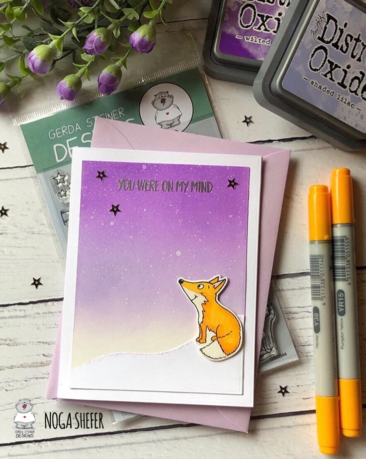 The sky was created by blending shaded lilac  and wilted violet distress oxide inks,